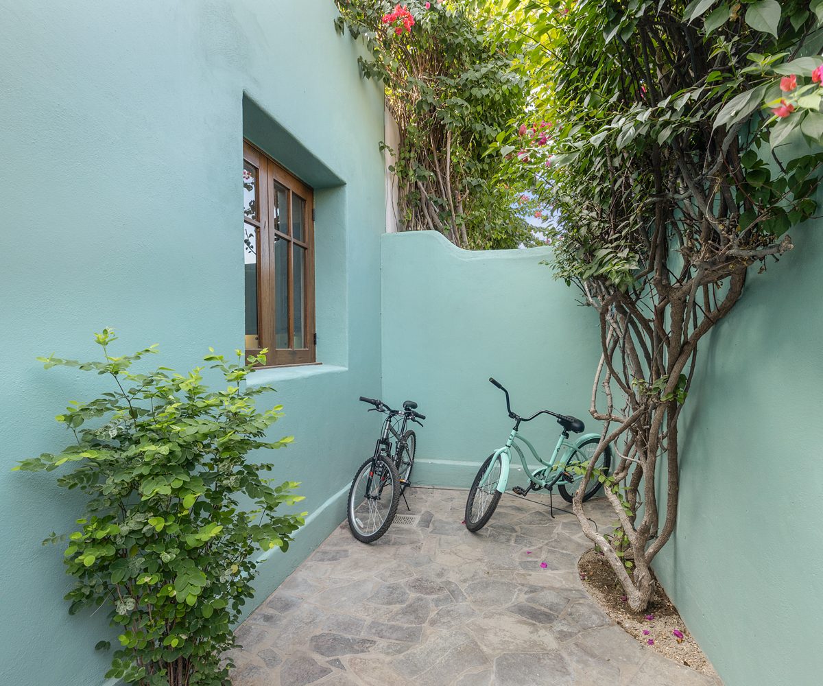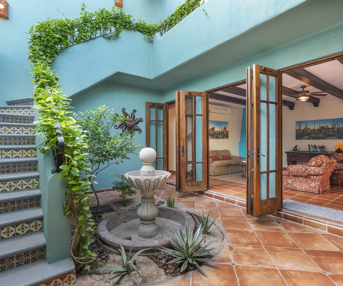 The ground level rooms center around a charming interior courtyard with a private pool. The backdrop of the pool is a wall of natural stone adding to the warm ambience of the property.