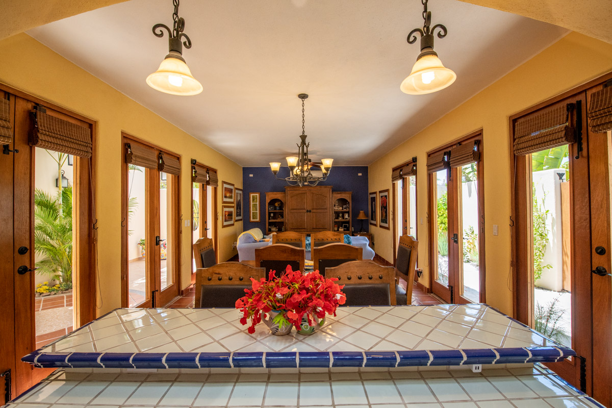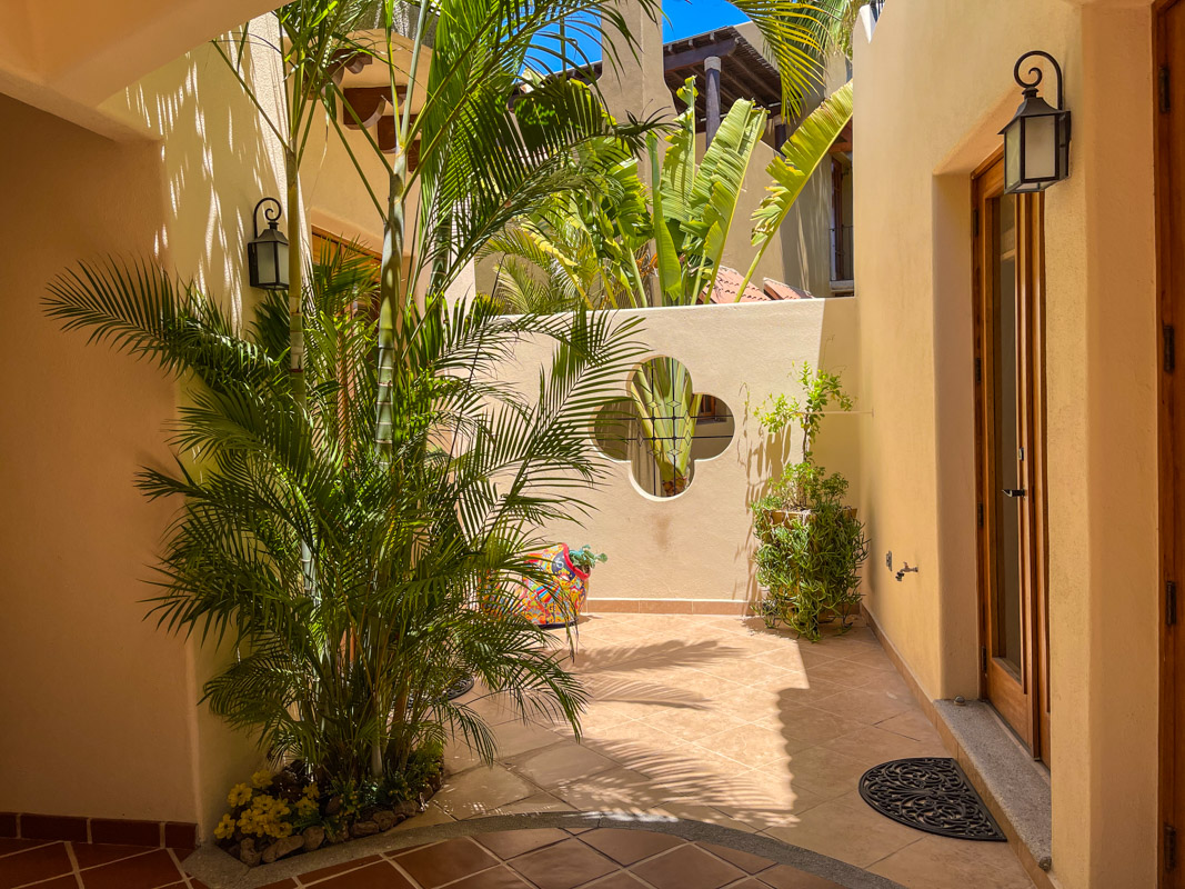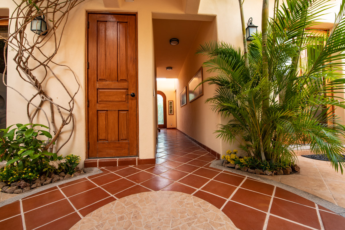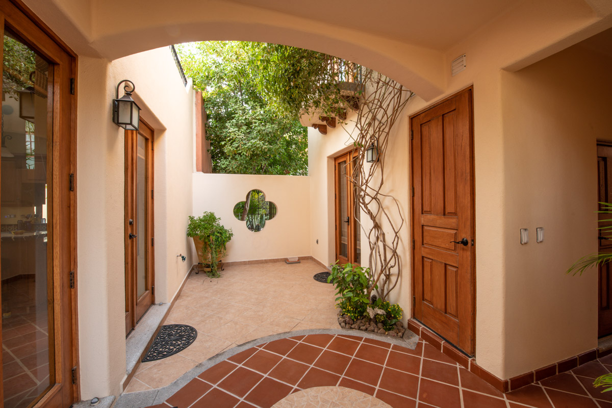 Gorgeous four bedroom/ four bathroom Casa de las Olas is ideally located on the community zocolo (large garden with a waterfall feature) and very close to one of the beautiful community pools and gourmet restaurants. Surrounded by gardens, Casa de las Olas is essentially open on all sides and creates the feeling that you are living in the middle of your own private garden oasis! A beautiful custom beveled glass front door invites the garden and natural light to enter but also provides privacy. On both sides of the great room (kitchen, living and dining room) there are two sets of glass doors that open up onto interior tropical gardens, full of flowering plants and space to entertain. The fully equipped kitchen has stainless steel appliances, a gas range and a tiled island with a bar, perfect for entertaining friends. There is a back garden and patio with room to store golf clubs and golf cart or kayaks.
