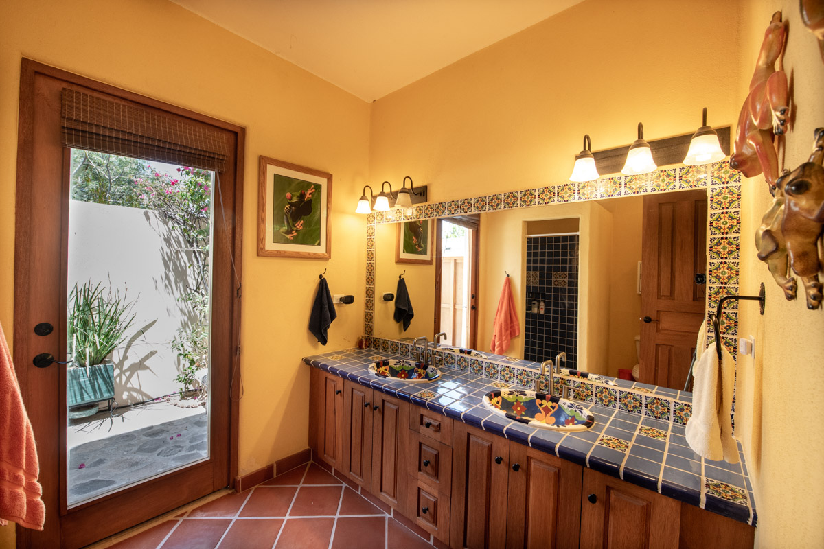 There are two master suites on the ground level, each separately accessed from the interior courtyard and each with their own large en suite full baths, which have glass doors that opens onto additional private courtyards. Each bathroom is decorated with custom talavera tile and hand painted double sinks. Currently one room is used as personal home gym.